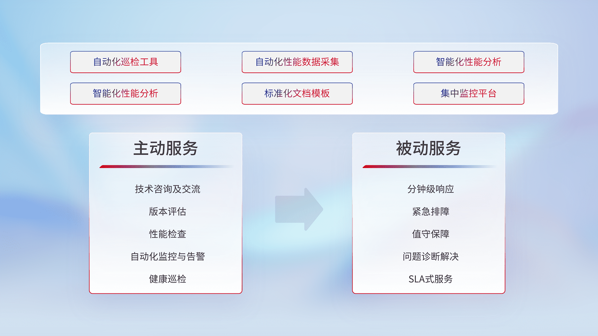 智能化工具和标准化文档,,,,保障服务质量,,提供主动服务(包含技术咨询、、、版本评估、、、性能检查、、、自动化监控与告警、、、、健康巡检)和被动服务包含(分钟级响应、、紧急排障、、、、值守保障、、、、问题诊断解决、、SLA服务)。。