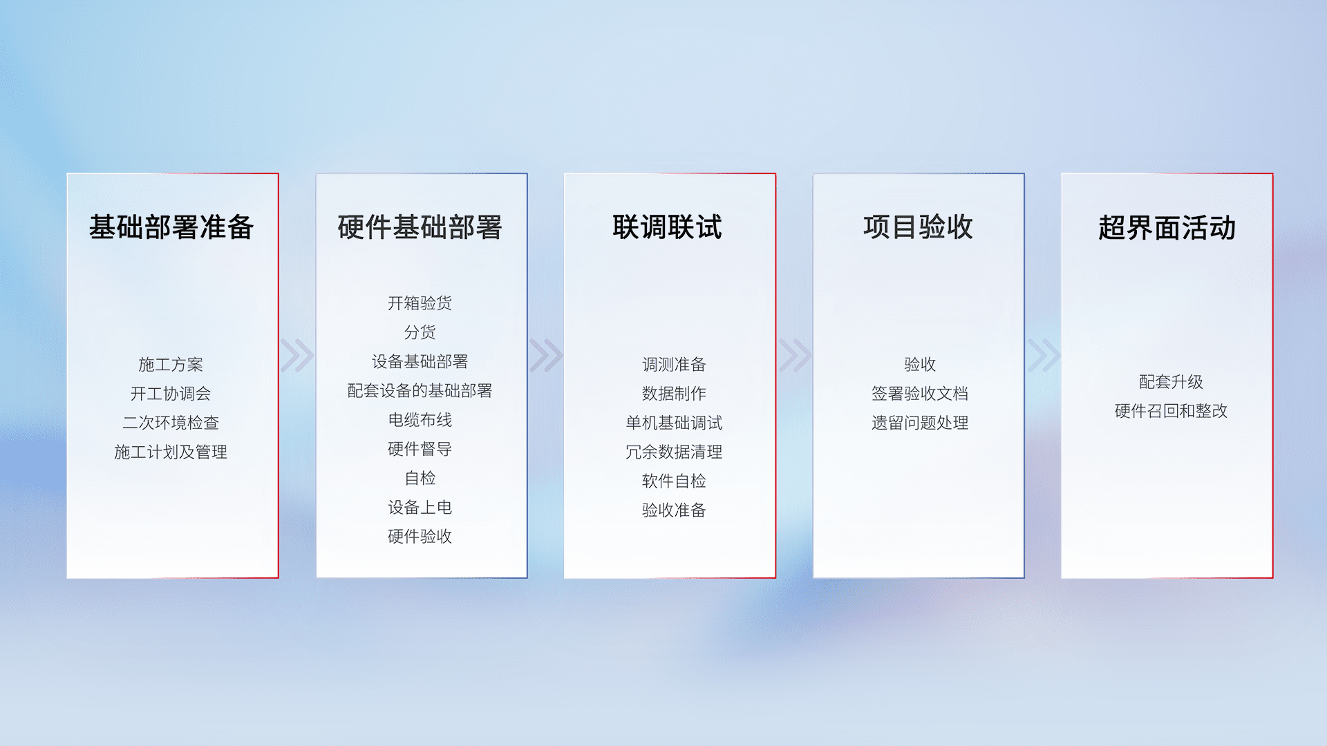 从基础部署准备、、硬件基础部署、、联调联试、、、、项目验收、、越界面活动的全过程可追溯,,,保证施工质量和进度。。。。